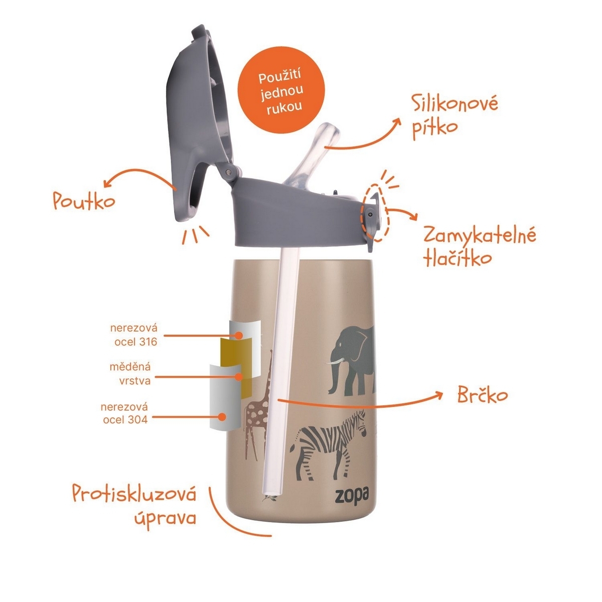 • materiál: nerezová ocel, silikon, plast bez BPA